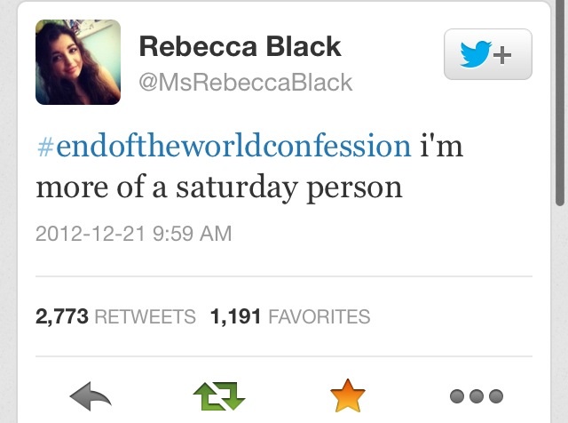 End of the world confession by Rebecca Black TwitterDecember 21, 201200BananersFounder and editor of Monkey Frolic.Share this:Tweet Email a link to a friend (Opens in new window) Email Share on Reddit (Opens in new window) Reddit